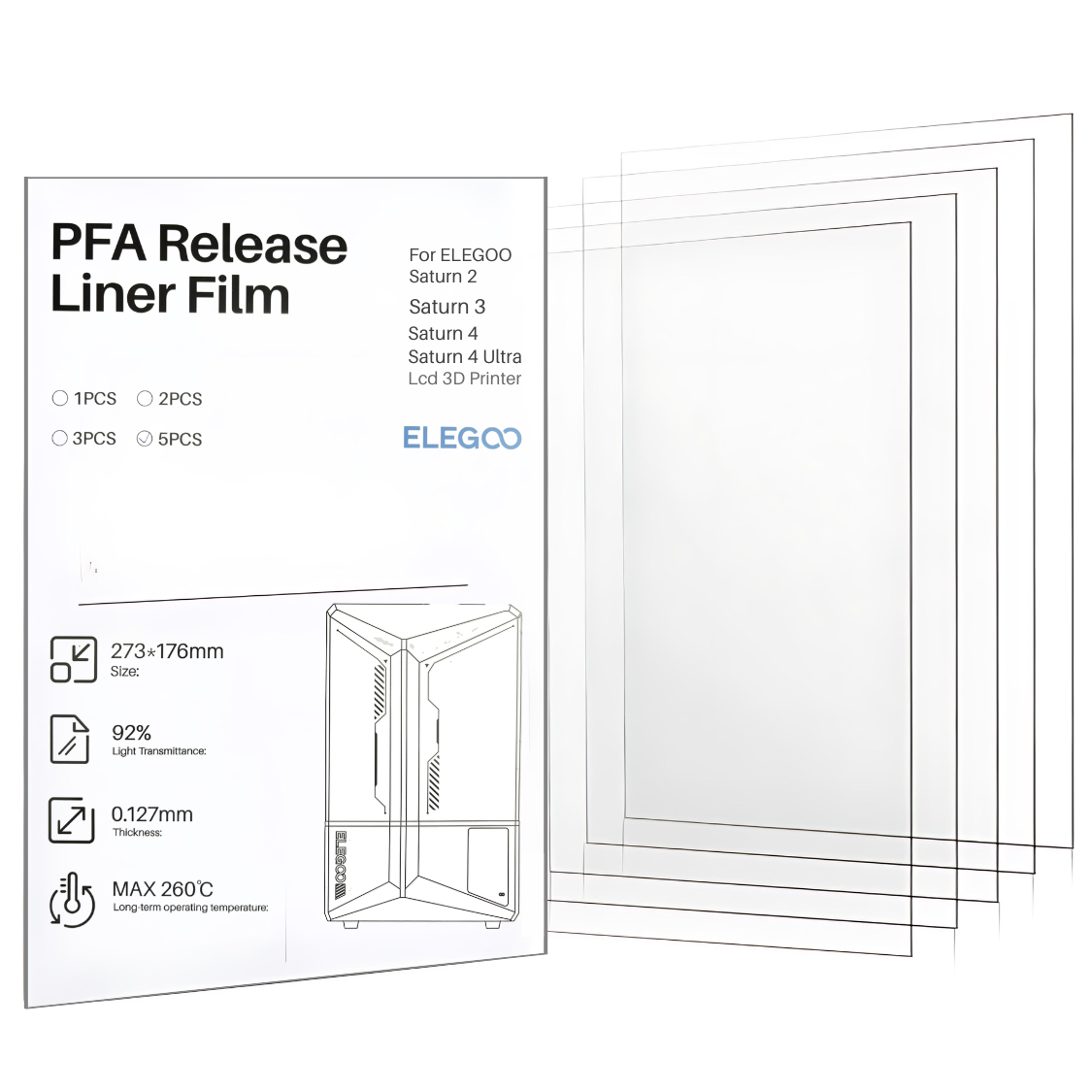 - Compatible Models: This ELEGOO PFA Film 5-Pack for Saturn Series includes films made specifically for ELEGOO Saturn 2, Saturn 8K, Saturn 3, Saturn 4, and Saturn 4 Ultra resin 3D printers, ensuring a precise fit and optimal performance.