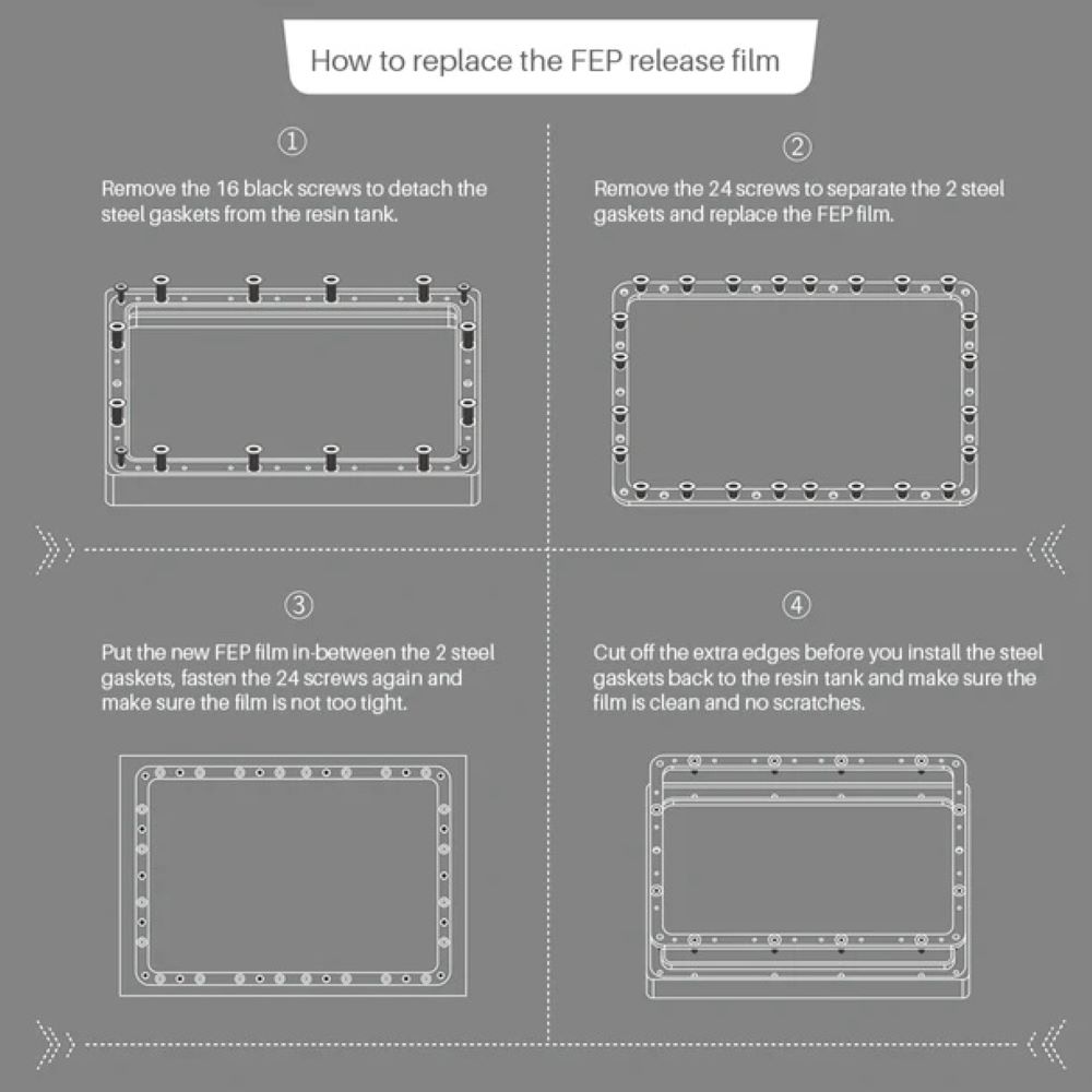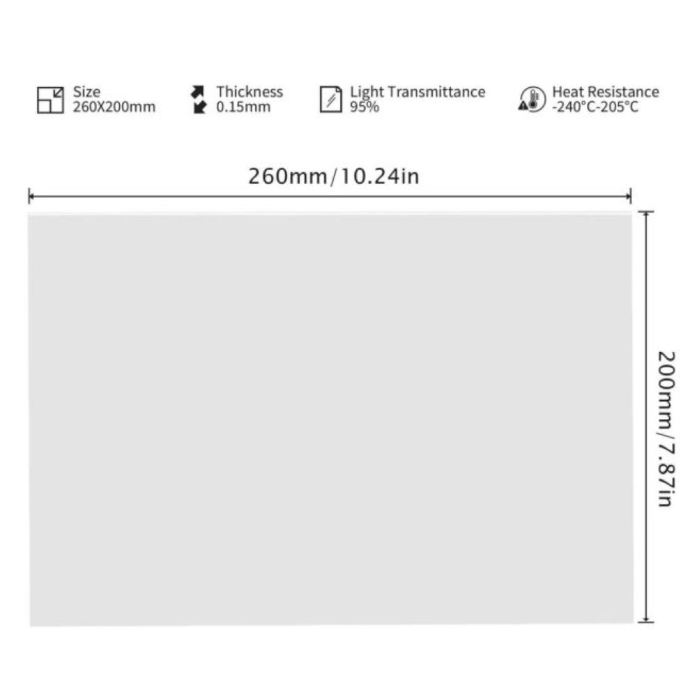 - High Purity FEP resin : FEP Film Sheet 260 * 200mm release film for 3D printing, using ultra-high purity FEP Film resin Made of hot-melt extrusion cast film. It has excellent non-stick, high-temperature resistance, electrical insulation, mechanical properties, wear resistance, and other characteristics.